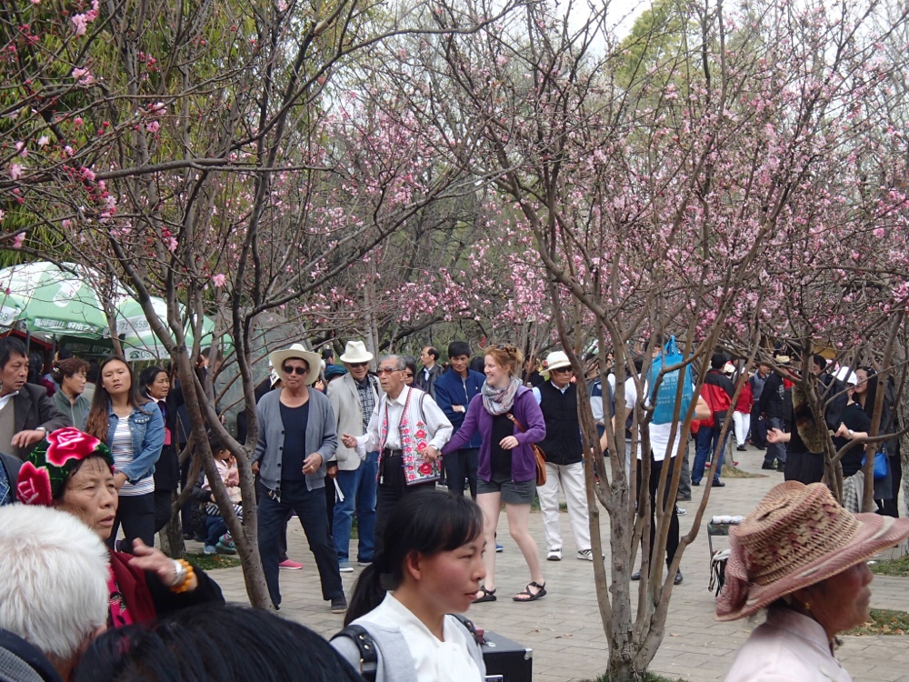 Today, we went for a walk to a popular park in town called Green Lake. It’s a lake with bridges and pathways weaving through it, and in one particular area, everyone (many, many seniors) come out and dance and sing! This happens every day of the week, but on the weekend it is packed. Yunnan has many minority ethnicities (more than elsewhere in China), particularly since it borders Tibet, Myanmar, Laos and Vietnam. This is reflected at Green Lake, as many of the minorities have storied histories of music. The key here is to join in and dance, and it’s not uncommon to get pulled into a dancing circle at any moment. This particular fellow grabbed my hand and then gave Brad a wave. Ha!