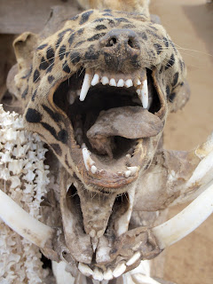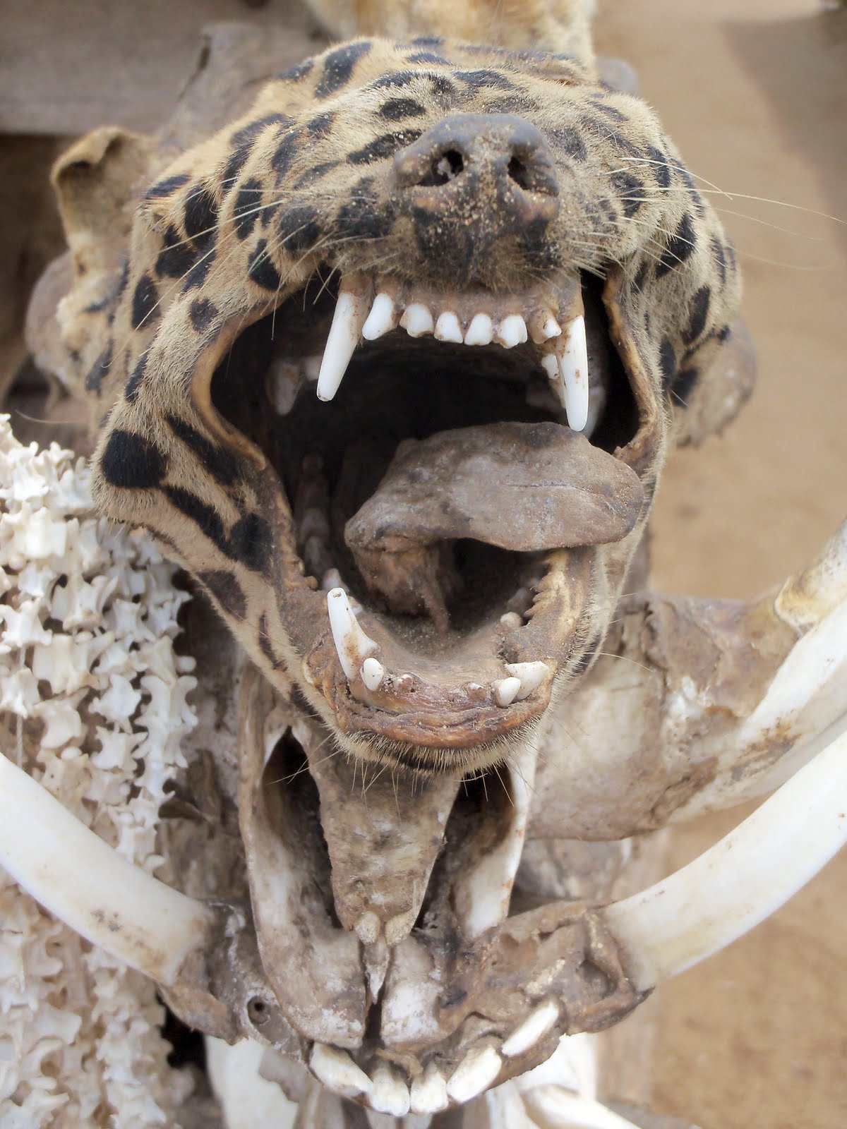 What the skulls and bones are used for is if someones sick, they consult the healer, and the healer will provide a mixture of different animals and herbs. There are key numbers…depending on your ailments it will be linked to 7, 9, or 41 ingredients (there are other numbers, but I cant remember them). Then, you go to the market, and buy the monkey skull, porcupine quills, elephant thigh, and whatever else is on your list. This is ground up into a powder, and then little cuts are made in your chest, under arms, and back. The powder is mixed with a bit of water, and put in the cuts. Voilà, your vaccine.